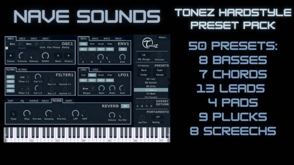 This pack contains 50 presets for ToneZ, 8 Bass presets, 7 Chords presets, 13 Lead presets, 4 Pad presets, , 9 Pluck presets and 8 Screech presets